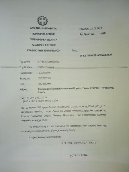 Σύμφωνα με άλλο έγγραφο που στάλθηκε με την υπογραφή της Περιφερειάρχου Αττικής, κυρίας Ρένας Δούρου, ορίστηκε πιο… χαλαρός χρόνος συνάντησης (χωρίς ένδειξη επείγοντος) στις 8:30 μ.μ. Για μια συνεδρίαση όπου τέθηκαν ζητήματα εκκένωσης, αντιμετώπισης της φωτιάς κλπ. ενώ ήδη τα πάντα είχαν καεί, η καταστροφή είχε συντελεσθεί και είχε αρχίσει η μακάβρια καταμέτρηση των θυμάτων!