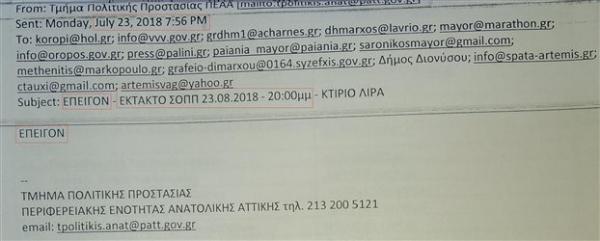 Σύμφωνα με τα έγγραφα που παρουσιάζει «Το Βήμα», στις 7:56 μ.μ. στάλθηκε ένα πρώτο e-mail σε αρμόδιους φορείς για να δώσουν παρόν στην σύσκεψη που οριζόταν για τις 8 η ώρα. Κι όλα αυτά, ενώ από τις 18:20 -σύμφωνα με την εικόνα της ΕΛ.ΑΣ και της Πυροσβεστικής- οι φλόγες είχαν εισβάλλει στην περιοχή Μάτι και λίγα λεπτά αργότερα είχαν κατακάψει τα πάντα και είχαν προκαλέσει εκατόμβη θυμάτων. Όμως κι αυτό το e-mail με την μορφή του επείγοντος που στάλθηκε περίπου 1,5 ώρα μετά την καταστροφή, όταν όλα είχαν κριθεί, δεν «εφαρμόσθηκε».