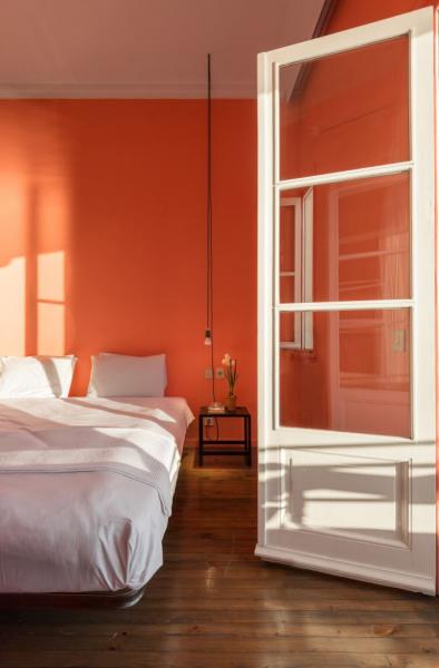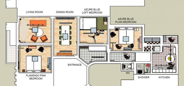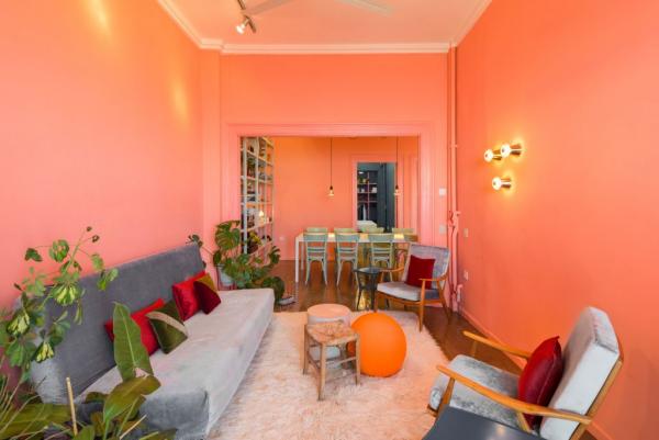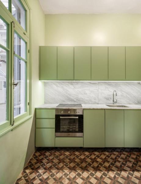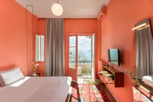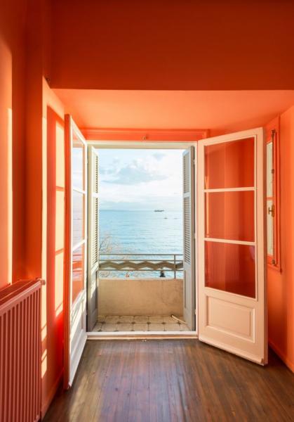 Οι χρωματισμένοι τοίχοι ροζ χρώμα, γαλάζιο και παστέλ πράσινο ορίζουν τις διάφορες περιοχές αυτού του παραθαλάσσιου διαμερίσματος στην Θεσσαλονίκη, από τον αρχιτέκτονα Σταμάτιο Γιαννίκη. Το Waterfront Nikis Apartment βρίσκεται σε ένα διατηρητέο κτήριο art-deco από το 1937, στην πόλη της Θεσσαλονίκης και συγκεκριμένα στην διάσημη παραθαλάσσια Λεωφόρο Νίκης.