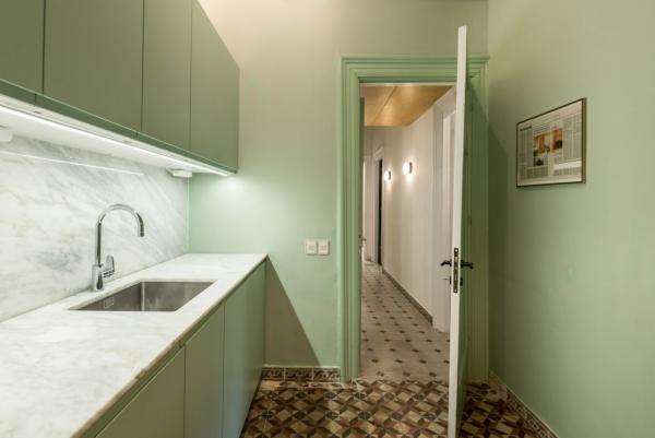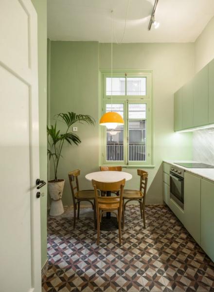 Ενώ η διαρρύθμιση του διαμερίσματος δεν άλλαξε κατά την ανακαίνιση, ο Γιαννίκης τοποθέτησε μια εντελώς νέα κουζίνα, ντους και τουαλέτα με νέα δάπεδα και υγειονομικά εξαρτήματα. Τα αρχικά εξαρτήματα art-deco – όπως το δάπεδο, η ξύλινη πόρτα και τα παράθυρα και τα διακοσμητικά στοιχεία γύψου στην οροφή – όλα διατηρήθηκαν και ανακαινίστηκαν.