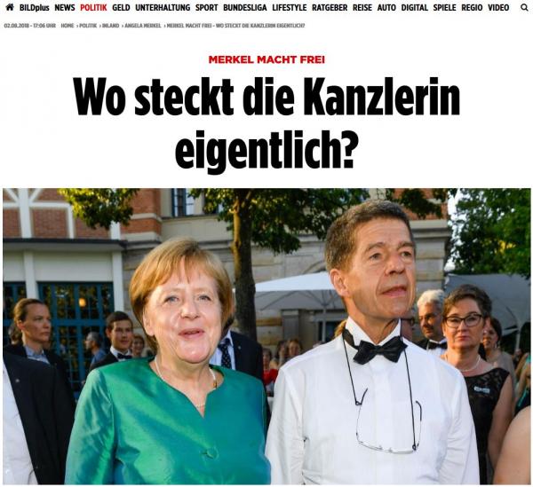 «Πού κρύβεται η καγκελάριος;» είναι ο τίτλος της. «Στη θερινή κατοικία ή με την 90χρονη μητέρα της στο Ούκερμαρκ; Κρίση στον γάμο; Κλινική; Μυστική αποστολή;»
