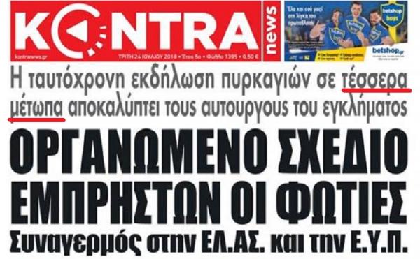 Το «Έθνος» μιλάει για 9 εμπρηστικούς μηχανισμούς και δημοσιεύει μάλιστα φωτογραφία από τα υποτιθέμενα ίχνη του εμπρηστικού μηχανισμού. Το επόμενο Σάββατο, το Έθνος μιλάει για 11 εμπρηστικούς μηχανισμούς, ενώ η KONTRA news μιλά για ξένους πράκτορες που πυρπόλησαν την Αττική.