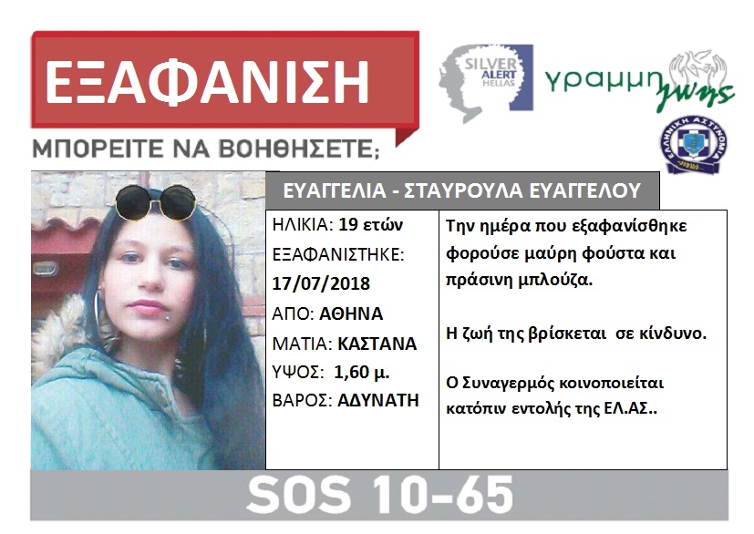 Εξαφανίστηκε στις 17/07/2018 από περιοχή της Αθήνας η 19χρονη Ευαγγελία – Σταυρούλα Ευαγγέλου.