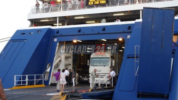 Στις 2:15 τα ξημερώματα αναχώρησε τελικά από το λιμάνι της Σύρου με 1.131 επιβάτες, το επιβατηγό οχηματαγωγό πλοίο Blue Star Paros που χθες στις 7 το απόγευμα κατά τη διάρκεια χειρισμών απόπλου του, παρασύρθηκε εξαιτίας ισχυρών πλευρικών ανέμων, με αποτέλεσμα ο δεξιός πρυμναίος καταπέλτης επιβατών, η ανύψωση του οποίου δεν είχε ολοκληρωθεί, να προσκρούσει στο λιμάνι και να προκληθεί ζημιά.