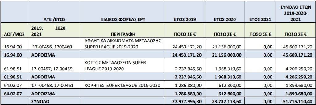 Πρόκειται για ποσά έξω από κάθε λογική. Συγκεκριμένα, το κόστος για την ΕΡΤ το 2019 θα είναι 28 εκατ. ευρώ των οποίων 25.5 εκατ. ευρώ είναι το κόστος δικαιωμάτων και χορηγίες προς Super League και 2.5 εκατ. το κόστος παραγωγής και μετάδοσης.