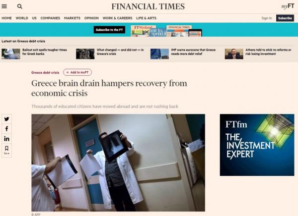 «Καθώς η Ελλάδα ετοιμάζεται να βγει από το μνημόνιο την επόμενη εβδομάδα, σε ένα δείγμα ότι η επιστροφή στην οικονομική κανονικότητα βρίσκεται κοντά, ο αριθμός των μορφωμένων Ελλήνων που δεν βλέπουν μέλλον στη χώρα αποτελεί ένα από τα σημαντικότερα εμπόδια στη μακροπρόθεσμη ανάκαμψη και σταθερότητα» γράφει χαρακτηριστικά η εφημερίδα.