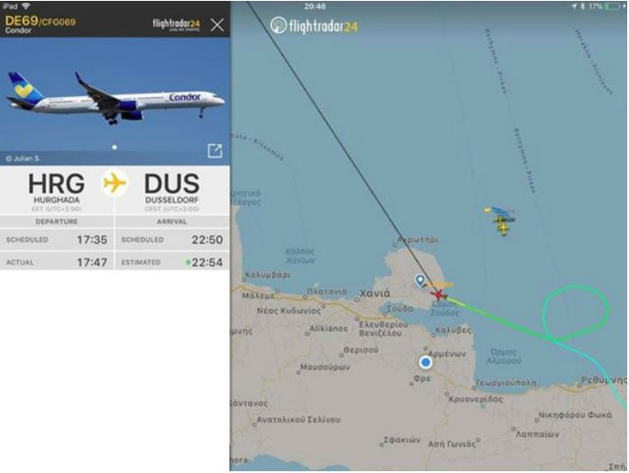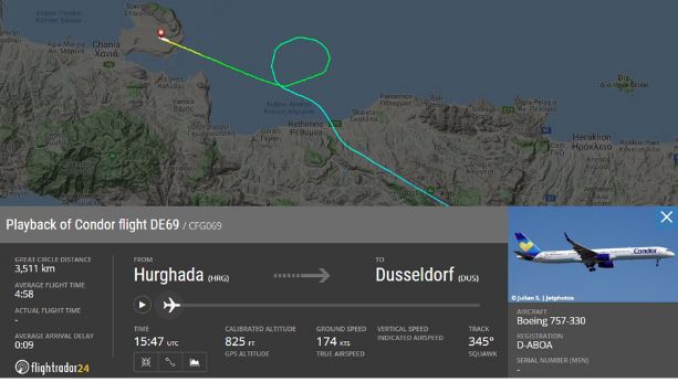 Το αεροσκάφος που εκτελούσε δρομολόγιο από την Αίγυπτο στη Γερμανία (Χουργκάντα-Ντίσελντορφ) μεταφέροντας 281 επιβάτες, προσγειώθηκε με ασφάλεια στο αεροδρόμιο Χανίων και οδηγήθηκε σε απομονωμένο χώρο μεταξύ του κεντρικού αεροσταθμού και της Αμερικανικής Βάσης Σούδας.
