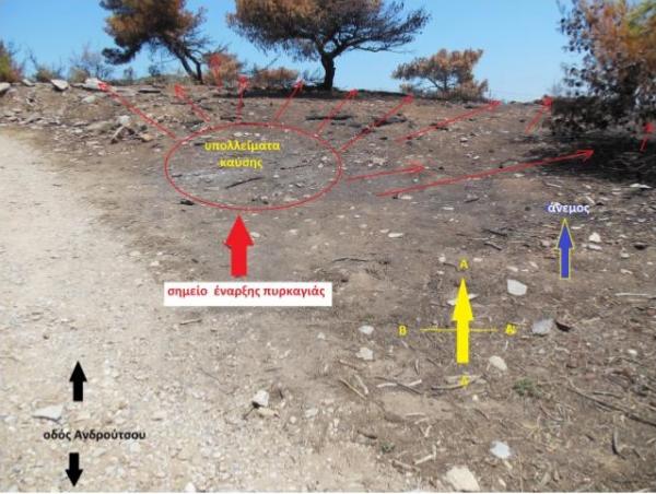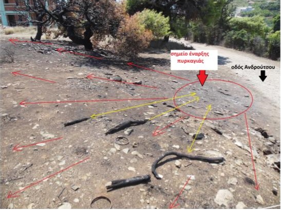 Πιο αναλυτικά από την έντονη παρουσία υπολειμμάτων πρόσφατης καύσιμης ύλης στην ως άνω περιοχή έναρξης της πυρκαγιάς, όπως πχ έντονη (λευκού) χρώματος στάχτη και πέριξ αυτής διασκορπισμένα σε πρόσφατο χρόνο καμένα μικρών διαστάσεων τεμάχια κούτσουρα και κλαδιά, τα οποία από τον πολύ έντονο βαθμό καύσης τους και σε βάθος προφανώς αποδεικνύει ότι και δεν κάηκαν στο σημείο αυτό μετά την εκδήλωση της πυρκαγιάς και εξ αιτίας αυτής, αλλά σε προγενέστερο χρόνο. Από διάφορους δείκτες πυρκαγιάς, όπως τη γωνία απανθράκωσης της βλάστησης καθώς και άλλους δείκτες, στην καμένη εντός της κρίσιμης περιοχής καύσιμης ύλης σε διάφορα αντικείμενα που βρέθηκαν κατά την έναρξη και εξάπλωση της πυρκαγιάς, όπως πχ μεγάλες πέτρες, καμένα άδεια κουτιά, δένδρα (κυρίως πεύκα) κλπ, εκτιμώ ότι στο εν λόγω σημείο έναρξης επί της οδού Ανδρούτσου (βλ. εικόνες 1 και 2) υπήρξε σε προγενέστερο της πυρκαγιάς χρόνο καύση υπολειμμάτων ποσότητας κλαδιών και λοιπής καύσιμης ύλης (κούτσουρα), για άγνωστο σε μένα λόγο.
