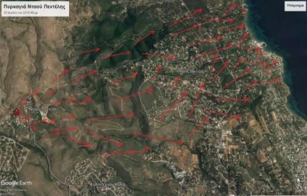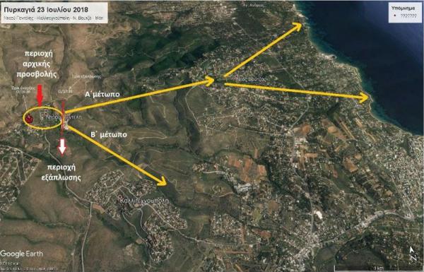 Η ως άνω πυρκαγιά, που εκδηλώθηκε περί ώρα Ω/16:49 μμ, λόγω των ισχυρών ανέμων που επικρατούσαν κατά την ώρα εκκίνησης, όπου εκείνη την ώρα επικρατούσαν άνεμοι με ελάχιστη ταχύτητα 45,1 km/h, δηλαδή ισχυροί άνεμοι έντασης 6 μποφόρ και με μέγιστη ταχύτητα 74 km/h, δηλαδή θυελλώδεις ανέμους εντάσεως 8 μποφόρ, με διεύθυνση Δυτική-Βορειοδυτική και του ανάγλυφου της ευρύτερης περιοχής, αλλά και επειδή οι πυροσβεστικές δυνάμεις στο αρχικό στάδιο προσβολής δεν κατόρθωσαν να την ελέγξουν αποτελεσματικά κυρίως στην περιοχή Νταού Πεντέλης, απέκτησε δυναμική (μεγάλη ένταση, πολύ υψηλό ρυθμό απελευθέρωσης θερμότητας κ.α) και διασπάσθηκε περί ώρα Ω/17:17 μμ έως Ω/17:30 μμ, το ενιαίο αρχικά μέτωπο, σε άλλα δύο και μάλιστα πέραν της κατά μέτωπο ανάπτυξης υπήρξε και πλευρική τους ανάπτυξη. Ειδικότερα μετά την περιοχή του Νταού Πεντέλης και συγκεκριμένα από το Μοναστήρι Παντοκράτορος και μετά το μέτωπο λόγω του ανάγλυφου (τοπογραφίας) πχ χαράδρες, μικρούς λόφους, διασπάστηκε και εξαπλώθηκε γρήγορα ανατολικότερα προς δύο κατευθύνσεις και μάλιστα σε (κατοικημένους) οικιστικούς ιστούς (βλ. εικόνα 3). Έτσι το ένα εξ αυτών των μετώπων και το πιο επικίνδυνο και καταστροφικό κατευθύνθηκε ανεξέλεγκτα, αφού δεν αποκόπηκε με την προσβολή του και δεν κατορθώθηκε να ελεγχθεί στο σημείο αυτό από τις πυροσβεστικές δυνάμεις, Βόρειο-Ανατολικά προς Νέο Βουτζά – Μάτι – Κόκκινο Λιμανάκι και το άλλο, το οποίο ευτυχώς παρεμποδίστηκε και κατασβέστηκε επιτυχώς και αποτελεσματικά – και ορθώς – από τις επιχειρούσες στην ευρύτερη αυτή περιοχή πυροσβεστικές δυνάμεις πριν εξαπλωθεί Νότιο-Ανατολικά προς τον οικισμό της Καλλιτεχνούπολης, και το επέτυχε, αφού το μέτωπο αυτό περιορίσθηκε μόνον στη χαράδρα της περιοχής, που βρίσκεται βόρεια του ως άνω οικισμού, χωρίς περαιτέρω ζημιές σε περιουσίες και ανθρώπινες απώλειες. Σημειώνεται δε ότι η απόσταση του σημείου εκκίνησης της πυρκαγιάς μέχρι το Μοναστήρι Παντοκράτορος είναι σε ευθεία γραμμή περίπου 500 μέτρα, ενώ μέχρι τις ακτογραμμές στο Μάτι και Κόκκινο Λιμανάκι που σταμάτησε η πυρκαγιά είναι πλέον των 5 χιλιομέτρων περίπου.