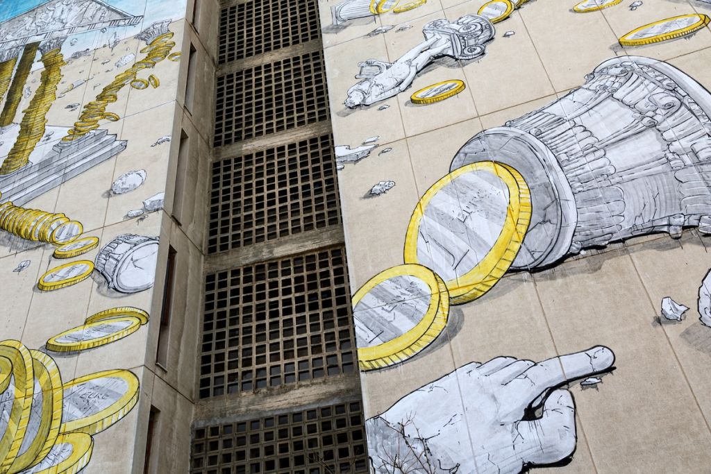 Στο σκίτσο φαίνεται η ΕΕ, η οποία, παρά το γεγονός ότι η Ελλάδα δεν έχει αναρρώσει, αφαιρεί μια πατερίτσα.