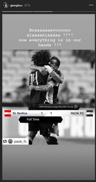 Ο γιος του μεγαλομετόχου του ΠΑΟΚ, Γιώργος Σαββίδης, συνεχάρη τους παίκτης της ομάδας για το αποτέλεσμα κόντρα στην Μπενφίκα μέσω του επίσημου λογαριασμού του στο Instagram