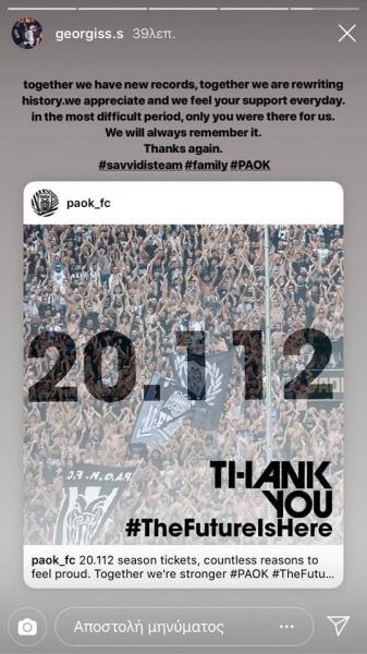 «Μαζί κάνουμε νέα ρεκόρ, μαζί ξαναγράφουμε την ιστορία. Εκτιμούμε και νιώθουμε τη συμπαράστασή σας κάθε μέρα. Στην πιο δύσκολη περίοδο, μόνο εσείς ήσασταν δίπλα μας. Θα το θυμόμαστε για πάντα. Σας ευχαριστούμε και πάλι», έγραψε χαρακτηριστικά στο Instagram ο Γιώργος Σαββίδης.