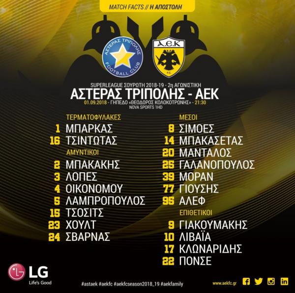 Εκτός αποστολής έμεινε ο Ντμίτρο Τσιγκρίνσκι που δεν είναι έτοιμος, ενώ επιστρέφει από τιμωρία ο Μάριος Οικονόμου. Στην Αθήνα θα μείνει για ατομικό πρόγραμμα και ο ανέτοιμος Γιαννιώτας.