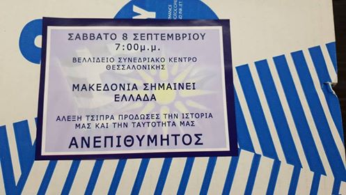 Στην πρωτεύουσα της Πιερίας κυκλοφόρησε αφίσα στην οποία αναγράφεται «ΔΕΝ ΞΕΧΝΑΜΕ» που απεικονίζει τον Έλληνα πρωθυπουργό μαζί με τον Σκοπιανό ομόλογό του αλλά και τους υπουργούς Εξωτερικών των δύο χωρών να υπογράφουν τη συμφωνία των Πρεσπών, καθώς και τρικάκια που καλούν τους πολίτες στη συγκέντρωση έξω από συνεδριακό κέντρο Ιωάννης Βελλίδης το Σάββατο 8 Σεπτεμβρίου στις 7 το απόγευμα και γράφουν «Αλέξη Τσίπρα πρόδωσες την ιστορία και την ταυτότητά μας, ΑΝΕΠΙΘΥΜΗΤΟΣ».