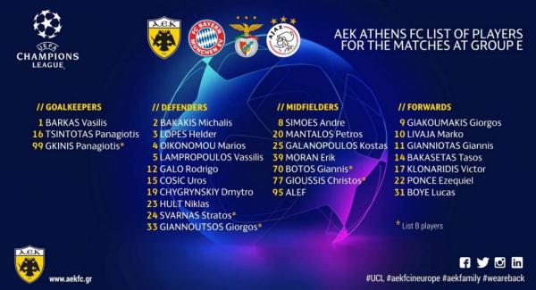 Αναλυτικά η λίστα της ΑΕΚ για τα ματς του Τσάμπιονς Λιγκ: