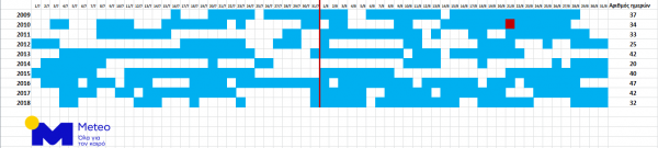 Αναλυτικότερα, οι μέρες των μελτεμιών της τελευταίας δεκαετίας στο Αιγαίο κατά το δίμηνο Ιουλίου-Αυγούστου είχαν ως εξής: 2009 37 μέρες, 2010 34 μέρες, 2011 33 μέρες, 2012 25 μέρες, 2013 42 μέρες, 2014 20 μέρες, 2015 40 μέρες, 2016 47 μέρες, 2017 42 μέρες και 2018 32 μέρες.
