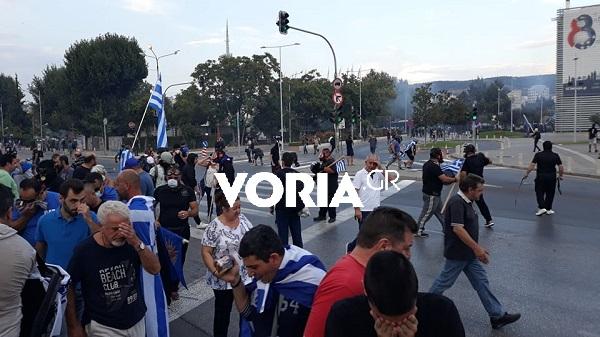 Διαδηλωτές που αντιδρούν στη Συμφωνία των Πρεσπών προσπάθησαν να προσεγγίσουν στο μπλόκο της αστυνομίας που έχει στηθεί στο σημείο προκειμένου να μην φθάσει το συλλαλητήριο στο «Βελλίδειο», όπου θα μιλήσει ο πρωθυπουργός.