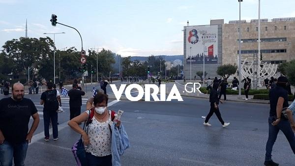 Η ατμόσφαιρα είναι πολύ βαριά από τα δακρυγόνα. Ενδεικτικό είναι ότι κάποιοι από τους προσκεκλημένους για τα εγκαίνια της ΔΕΘ φθάνουν στο «Βελλίδειο», καλύπτοντας με μαντίλια μύτη και στόμα.