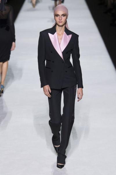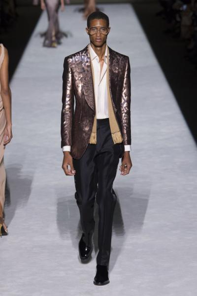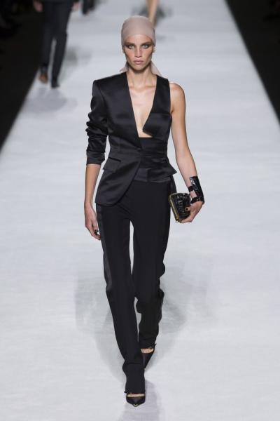 Υπήρχαν ταγιέρ με κορσέδες, ανδρικά και γυναικεία κοστούμια για αυτούς που λατρεύουν το μετάξι και την ντίσκο, δαντέλα κάτω από το στρίφωμα της φούστας και φορέματα ζέρσει της δεκαετίας του ’70 . Όλα αυτά ήρθαν σε μαύρες, λευκές, αποχρώσεις του δέρματος και αχνά λιλά. Για τους κύριους, ο Ford ενώνει τα κοστούμια του με πουκάμισα και πουλόβερ σε γήινους τόνους και τα σακάκια φοριούνται σε ένα πολύ εντυπωσιακό lamé ζακάρ. Η σχετική «ηρεμία» της συλλογής συνεχίστηκε με επισημασμένο δέρμα πόνι, μετάξι και δέρμα. «Αισθάνομαι ότι η μόδα έχει χάσει κάπως το δρόμο της και είναι εύκολο για όλους μας να ακολουθήσουμε τις τάσεις που έχουν χάσει την επαφή με το τι θέλουν να φορέσουν οι γυναίκες και οι άνδρες», γράφει ο Ford.