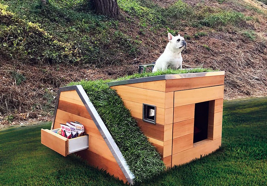 Ένα χαλί από γρασίδι ανεβαίνει μια ράμπα στο πλάι του σπιτιού για το αγαπημένο τετράποδο και καλύπτει όλη την οροφή, μειώνοντας τη θερμοκρασία στο εσωτερικό (για να μην σκάει απ’ τη ζέστη, υπάρχει και ανεμιστήρας που κινείται με ηλιακή ενέργεια). Επιπλέον, η οροφή είναι εξοπλισμένη με βρυσούλα – ενεργοποιείται αυτόματα, με την κίνηση του τετράποδου -, αλλά και με σιφόνι για τον καθαρισμό της στέγης.