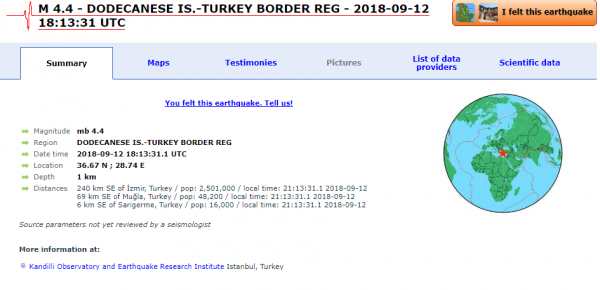Σεισμική δόνηση μεγέθους 4,4 βαθμών Ρίχτερ καταγράφτηκε στην Τουρκία στις 21:13 (τοπική ώρα) ο οποίος έγινε αισθητός και στα Δωδεκάνησα αλλά κυρίως στη Ρόδο.