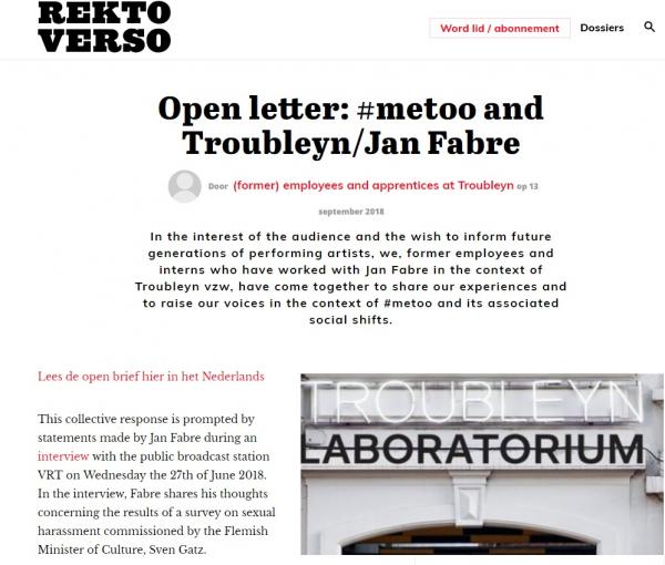 Η επιστολή, η οποία υπογράφεται κυρίως από γυναίκες, οκτώ εξ αυτών επώνυμα, αναφέρει πως «η ταπείνωση ήταν καθημερινό ψωμί» στους κόλπους του θιάσου Troubleyn, ενώ διευκρινίζουν ότι προσκαλούσε στο σπίτι του καλλιτέχνες με πρόσχημα παραστάσεις αναπαραστατικής τέχνης και επιχειρούσε τότε «σεξουαλική προσέγγιση».