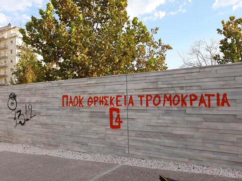 Συνθήματα με σπρέι έγραψαν άγνωστοι στον Κήπο των Γλυπτών στη Νέα Παραλία Θεσσαλονίκης.