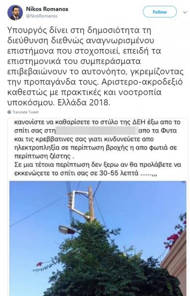 Ειδικότερα, στο twitter αναφέρει τα εξής: «Υπουργός δίνει στη δημοσιότητα τη διεύθυνση διεθνώς αναγνωρισμένου επιστήμονα που στοχοποιεί, επειδή τα επιστημονικά του συμπεράσματα επιβεβαιώνουν το αυτονόητο, γκρεμίζοντας την προπαγάνδα τους. Αριστερο-ακροδεξιό καθεστώς με πρακτικές και νοοτροπία υποκόσμου. Ελλάδα 2018».