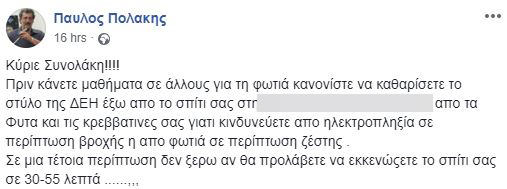 Στην προσπάθεια αποδόμησης του πορίσματος του καθηγητή καθηγητή Κώστα Συνολάκη, μέσα από προσωπική επίθεση στον διεθνούς φήμης αναγνωρισμένο ακαδημαϊκό καθηγητή Φυσικών Καταστροφών προχώρησε ο Παύλος Πολάκης επιλέγοντας μάλιστα να αναρτήσει στο Facebook τη διεύθυνση του σπιτιού του