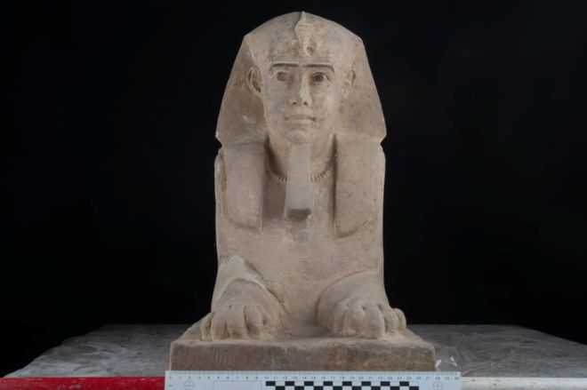 Το υπουργείο Αρχαιοτήτων ανακοίνωσε ότι το άγαλμα του μυθικού αυτού τέρατος, με κεφάλι ανθρώπου και σώμα λιονταριού, είναι κατασκευασμένο από ψαμμόλιθο.