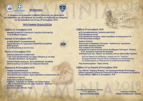 Το τελευταίο Σάββατο του Σεπτεμβρίου η αναπαράσταση θα γίνει στην προβλήτα του Καματερού με την ταυτόχρονη εξιστόρηση των ιστορικών γεγονότων. Η εκδήλωση θα ολοκληρωθεί μέσα σε μια πανδαισία πυροτεχνημάτων και βεγγαλικών. Οπως κάθε χρόνο, έτσι και εφέτος στους εορτασμούς θα λάβει μέρος μεγάλος αριθμός κατοίκων της Σαλαμίνας και θα την τιμήσουν με την παρουσία τους πλήθος επίσημοι, εκπρόσωποι της Πολιτείας, της Εκκλησίας, των αρχών καθώς και των γραμμάτων και των τεχνών.