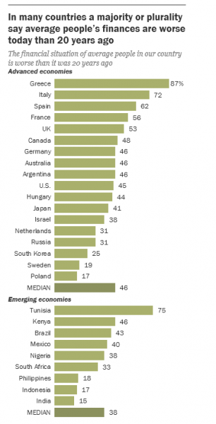 Μαζί με την αποτυχία να εξαλείψουμε τις αμφιβολίες για το μέλλον, η οικονομική σταθερότητα σήμερα υποσιτίζεται από τη λαϊκή πεποίθηση ότι οι καιροί ήταν καλύτεροι πριν από τη μεγάλη ύφεση. Συγκεκριμένα, 15 από τα 27 κράτη πιστεύουν ότι, σε σύγκριση με πριν από 20 χρόνια, η οικονομική κατάσταση των ανθρώπων της μεσαίας τάξης στη χώρα τους είναι χειρότερη σήμερα. Αυτή η άποψη είναι ιδιαίτερα έντονη στην Ελλάδα (87%), την Τυνησία (75%), την Ιταλία (72%), την Ισπανία (62%), τη Γαλλία (56%) και το Ηνωμένο Βασίλειο (53%).