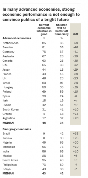 Σημειώνεται ότι η απαισιοδοξία για το μέλλον είναι χαρακτηριστικό πρωτίστως των αναδυόμενων οικονομιών. Σχεδόν τα 2/3 των Τυνήσιων (64%) και πάνω από τους μισούς Βραζιλιάνους (53%) δηλώνουν απαισιόδοξοι για το μέλλον των παιδιών τους, εκτιμώντας μάλιστα ότι θα είναι σε χειρότερη θέση από τους ίδιους.