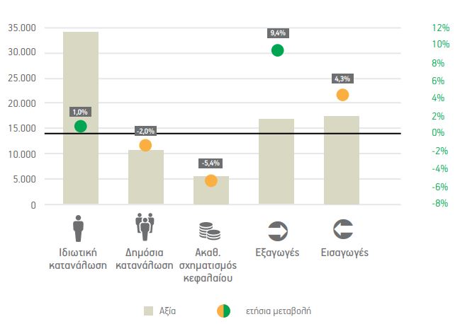 Στον αντίποδα τώρα οι επενδύσεις (ακαθάριστος σχηματισμός παγίου κεφαλαίου) σημείωσαν κάμψη κατά 5,4% που οφείλεται εξ ολοκλήρου στην κατηγορία «μεταφορικός εξοπλισμός και οπλικά συστήματα».
