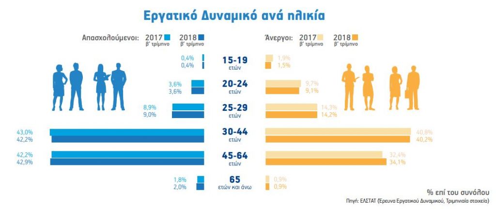Ο αριθμός των απασχολουμένων ανήλθε σε 3,86 εκατ., αυξημένος κατά 1,8% σε σχέση με το β’ τρίμηνο του 2017 και ο αριθμός των ανέργων περιορίστηκε σε 906 χιλ., μειωμένος κατά 10,9% σε σχέση με το αντίστοιχο τρίμηνο του 2017.