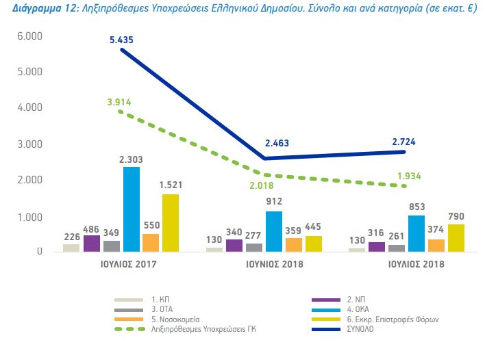 Τον Ιούλιο του 2018, οι ληξιπρόθεσμες υποχρεώσεις της Γενικής Κυβέρνησης (ΓΚ) (συμπεριλαμβανομένων των εκκρεμών επιστροφών φόρων) ανήλθαν σε 2.724 εκατ. ευρώ.