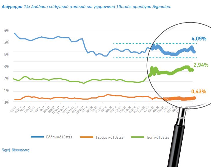 Οι εξαγγελίες-ανακοινώσεις του κυβερνητικού συνασπισμού στην Ιταλία, ο εικαζόμενος «εμπορικός πόλεμος» μετά την επιβολή δασμών από τις ΗΠΑ και η αστάθεια της τουρκικής οικονομίας η οποία θα μπορούσε να πιέσει περαιτέρω τις χρηματιστηριακές αγορές της Ευρώπης (contagion), επηρεάζουν αρνητικά τις αποδόσεις των ομολόγων της «ευρωπαϊκής περιφέρειας», συμπαρασύροντας τις αποδόσεις των ελληνικών ομολόγων, προστίθεται στην έκθεση.