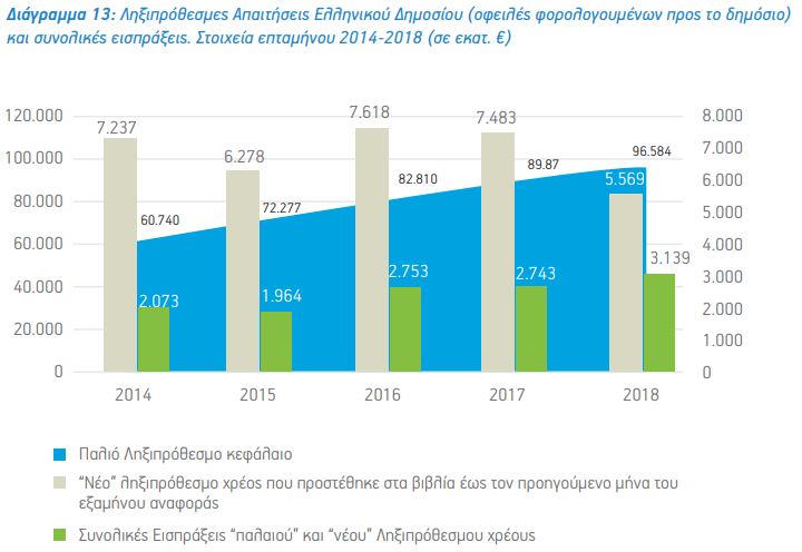 Το γεγονός αυτό αποδίδεται στην συνεχή υστέρηση των εισπράξεων έναντι των νέων ληξιπρόθεσμων απαιτήσεων που ανακύπτουν. Ωστόσο, η υστέρηση αυτή καταγράφει φθίνοντα ρυθμό το τρέχον έτος σε σχέση με τα προηγούμενα και αυτό οφείλεται τόσο στις βελτιωμένες εισπράξεις, όσο και στην συγκριτικά χαμηλότερη δημιουργία νέου ληξιπρόθεσμου χρέους.