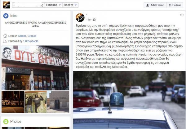 Σε ανάρτηση του στον προσωπικό του λογαριασμό στο Facebook αναφέρει για την παρακολούθηση και σύλληψη του: