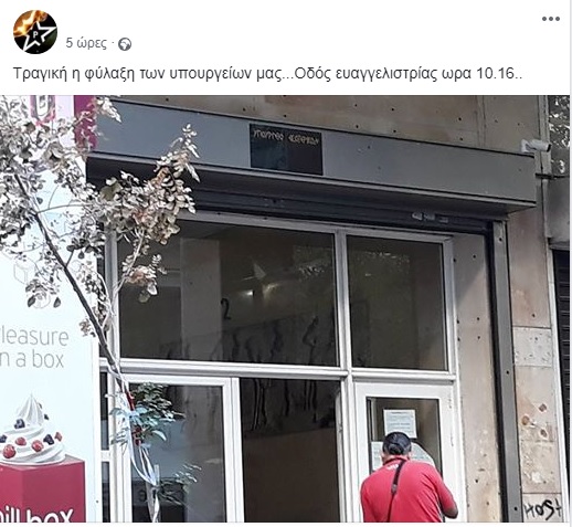 Μάλιστα ανέβασε στο Facebook τη φωτογραφία του αφύλαχτου υπουργείου σχολιάζοντας ειρωνικά: «Τραγική η φύλαξη των υπουργείων μας…Οδός ευαγγελιστρίας ωρα 10.16»!