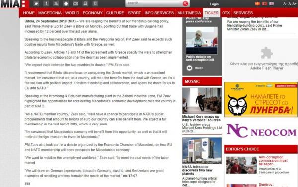 Στο πλαίσιο αυτό ο Ζάεφ δήλωσε «πεπεισμένος ότι ως χώρα θα δρέψουμε τους καρπούς από τη συμφωνία με την Ελλάδα, καθώς η συμφωνία συνιστά δίκαιη λύση με θετική πολιτική επίπτωση», προτρέποντας τους σκοπιανούς επιχειρηματίες «να κατακτήσουν την ελληνική αγορά» η οποία, όπως είπε, «είναι εξαιρετική», σύμφωνα με το πρακτορείο ΜΙΑ.