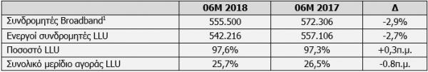 Στο 1ο εξάμηνο του 2018 οι ενεργοί συνδρομητές LLU ήταν 542 χιλιάδες.