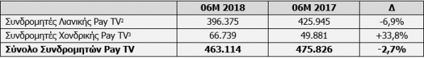 Στο τέλος του 1ου εξαμήνου του 2018, η συνδρομητική βάση Pay TV έκλεισε στους 463 χιλιάδες συμπεριλαμβανομένων των συνδρομητών λιανικής και χονδρικής σε Ελλάδα και Κύπρο.