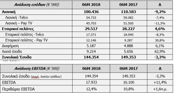 Βελτίωση του EBIDTA κατά 11,4%, στα 17,9 εκατ. ευρώ, πέτυχε η Forthnet στο πρώτο 6μηνο του 2018, παρά την υπερφορολόγηση που πλήττει τις αγορές συνδρομητικής τηλεόρασης και τηλεφωνίας. Τα έσοδα της εταιρείας διαμορφώθηκαν σε 144,4 εκατ. ευρώ καταγράφοντας μικρή πτώση κατά 3,3% σε σχέση με το πρώτο εξάμηνο του 2017.