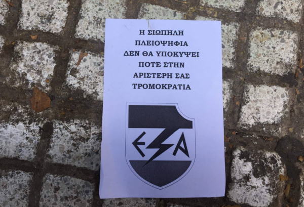 Νωρίτερα, έκανε την εμφάνισή της μικρή ομάδα ακροδεξιών που φώναξαν ρατσιστικά συνθήματα και πέταξαν τρικάκια. Η ομάδα φορούσε μαύρες μπλούζες με διακριτικά που παραπέμπουν στην ΕΣΑ και το ΕΑΤ – ΕΣΑ.
