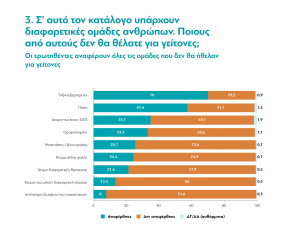 Φόβος και έλλειψη εμπιστοσύνης οδηγούν σε μια αναδίπλωση και σε πιο συντηρητικές απόψεις. Από τις αξίες που πρέπει να μαθαίνουν τα παιδιά στο σπίτι, η πλειοψηφία των ερωτηθέντων επιλέγουν «τους καλούς τρόπους», «την εργατικότητα», «την υπευθυνότητα» και «την επιμονή», αλλά μόνο το 17% επέλεξαν «τη φαντασία» και μόνο ένα 22% «την ανιδιοτέλεια’. Επιπλέον, 1 στους 3 Έλληνες δηλώνουν πως δεν θα ήθελαν γείτονες ομοφυλόφιλους, 1 στους 4 ότι δεν θα ήθελαν γείτονες μετανάστες, 1 στους 5 ότι δεν θα ήθελαν για γείτονες άτομα «διαφορετικής θρησκείας». Και 1 στους 12 δεν θα ήθελαν για γείτονες «ανύπαντρα ζευγάρια που συγκατοικούν».