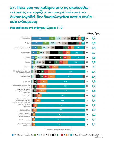 Παρ’ όλον, όμως, αυτό τον θύμο η μεγάλη πλειοψηφία πιστεύει στην κοινωνική αλλαγή μέσω μεταρρυθμίσεων (62,9%) και μόνο το 16,3% πιστεύει ότι χρειάζεται επαναστατική δράση. Όμως, έχει σημασία ότι στους νέους 18-29 αυτό το ποσοστό φτάνει στο 25,4% (στους φοιτητές φτάνει το 28,2%).