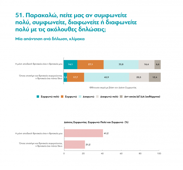 Η συντηρητική αναδίπλωση αποτυπώνεται και στη στροφή προς τη θρησκεία. Οι ερωτηθέντες δηλώνουν «είμαι ένα θρησκευόμενο άτομο» σε ποσοστό 81,4% (70% των νέων). Βαθμολογώντας το «πόσο σημαντικός είναι ο Θεός» στη ζωή τους κατά μέσο όρο έβαλαν βαθμό 8,1, με το 45% να δηλώνει «10». Μάλιστα, ένα 41,2% υποστηρίζει ότι «η μόνη αποδεχτή θρησκεία είναι η θρησκεία μου.