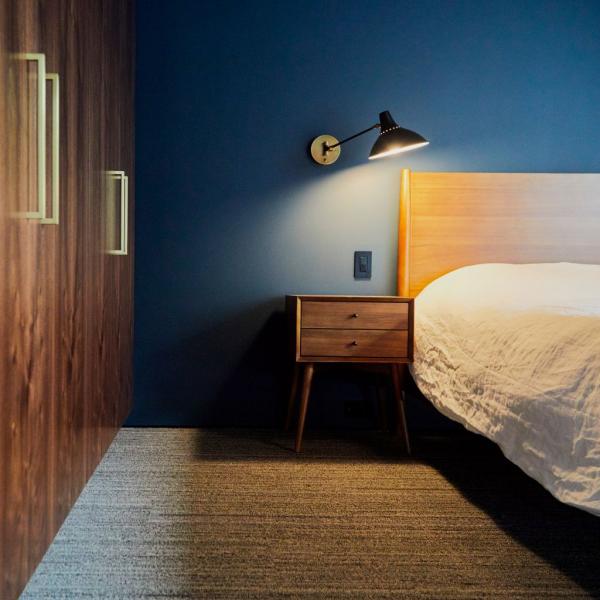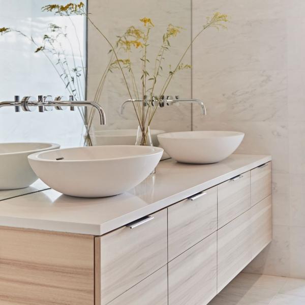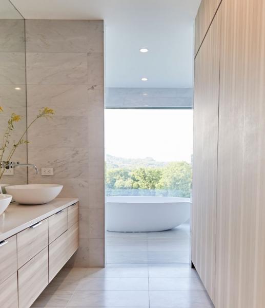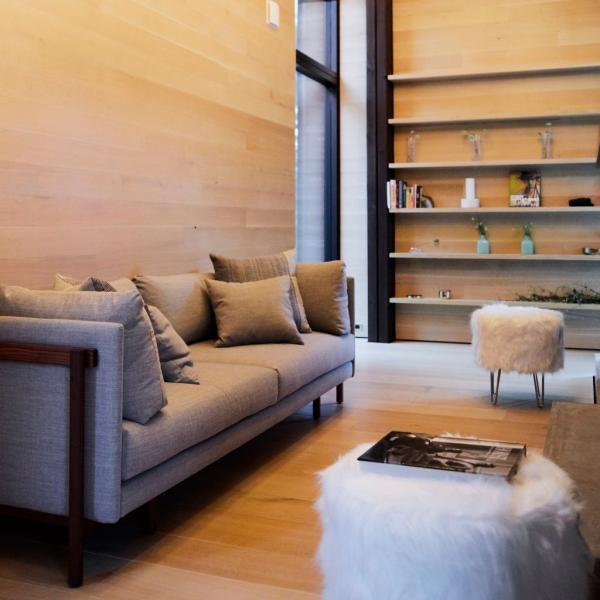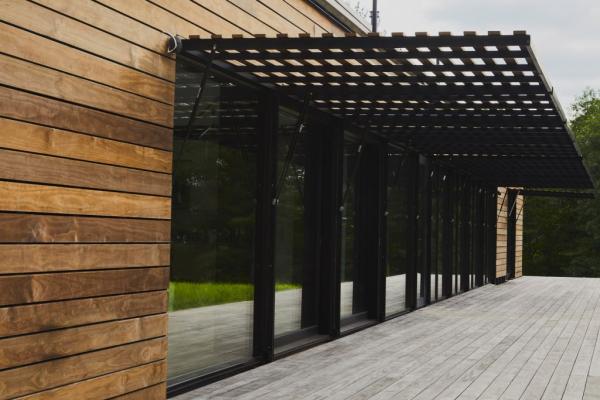 Οι εξωτερικοί τοίχοι είναι επενδυμένοι με πεύκο που εγχέεται με υγρό βιολογικής προέλευσης, δίνοντας χαρακτηριστικά σκληρού ξύλου. Με αντοχή σε έντομα και μούχλα, ο ξύλινος τοίχος αφέθηκε άβαφτος για ένα πιο φυσικό αποτέλεσμα.