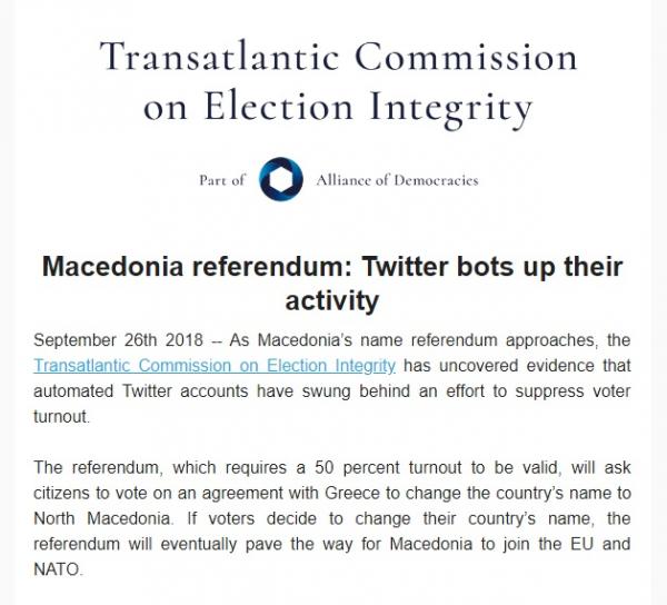 «Τα αφηγήματα που διανέμουν αυτά τα bots επιζητούν να στηρίξουν το κίνημα για μποϊκοτάρισμα (σ.σ του δημοψηφίσματος) και τους πολιτικούς ή αξιωματούχους που το έχουν υποστηρίξει», αναφέρει σε ανακοίνωσή της η Επιτροπή, που εδρεύει εδρεύει στην Κοπεγχάγη και έχει ιδρυθεί από τον πρώην γενικό γραμματέα του NATO, Άντερς Φογκ Ράσμουσεν.